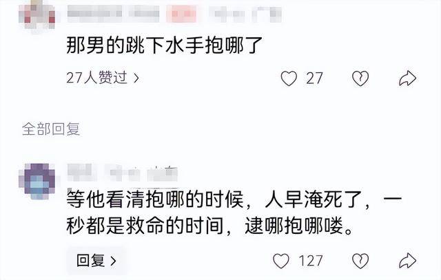 更离谱的是还有网友在居高临下地质问,岸上那么多大老爷们,为什么就只有他一个跳下去了?这不就是道德绑架吗?真是站着说话不腰疼,这位网友如果在现场,说不定也只是站在旁边看看,而且救人不是喊口号,是需要能力和勇气的,不是每个在岸边的人都具备游泳救人的能力。